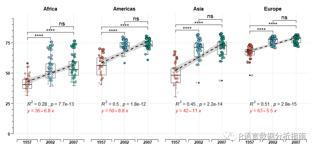 ❝还是熟悉的配方,在此只需要注意 「aes(group=1)」 参数,此参数只能用于「局部映射」,图中若要改为添加R值只需将「rr.label」改为「r.label」,可以看到此图包含的内容十分丰富基本涵盖了我所知的所有分析,希望对大伙有所帮助;那么本节介绍到此结束;
