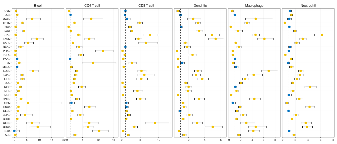 ggplot(aes(cancer,`Odds Ratio`,ymin=`Low 95% CI`,ymax=`High 95% CI`))+