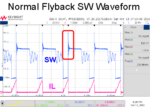 开关器件关断时刻的电压尖峰主要是由电感续流引起的,其中电感主要来自于变压器初级漏感和和线路中的分布电感,而电压尖峰正是由初级漏感的能量泄放,最终将开关器件源漏间的结电压冲高而引起的。