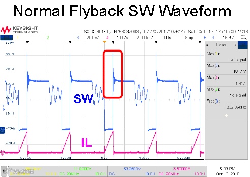 开关器件开通时刻的振铃是由电容和等效电感的谐振产生的,电容是开关器件的结电容,电感主要是初级侧的励磁电感,开关器件的结电压在谐振状态下会不停地变化,因而在不同的开通时刻损耗也不同,通常在较低电压下开通损耗也会较低。当然,针对开通损耗也常采用零电压开关(ZVS)和零电流开关(ZCS)技术。