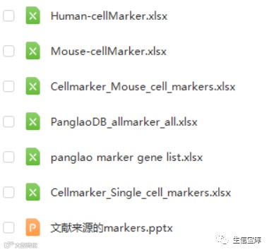 其实这里由于篇幅问题,小编只是列举了一部分细胞的标志基因,事实上每一种细胞的细胞的marker基因在随着单细胞测序的使用每年都在不断增加,小编已经把总结好的marker基因Excel表格传到百度网盘了,并且把一些经典文献用到的marker基因做成了PPT,关注”生信宝库”公众号,在后台回复“markers”即可获得,具体内容如下图所示: