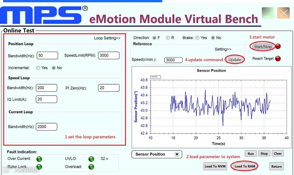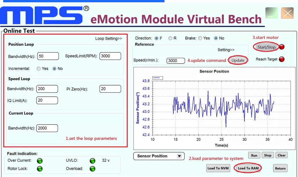 在全集成的硬件中,我们将电机、控制芯片、传感器、MOSFET和驱动模块集成在一起,客户只需接上电源和通信接口,便可以轻松使用,如果需要调整或设置参数,直接使用我们的人性化GUI设定好参数、自动仿真,可实时在线显示转速和位置。