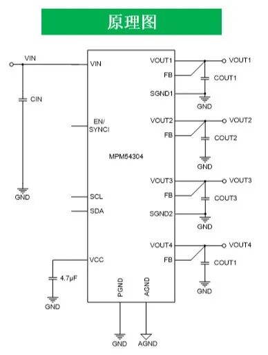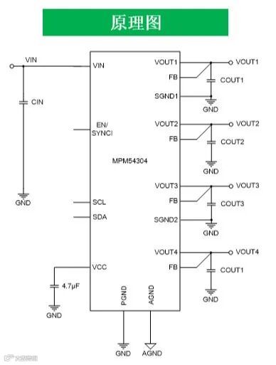 MPM54304是业界首款PMIC模块,可以控制四路电源:2路3A和2路2A电源轨,最关键的是可以灵活实现各种时序要求,还能使用I2C总线通过MTP(可多次编程)来配置参数。