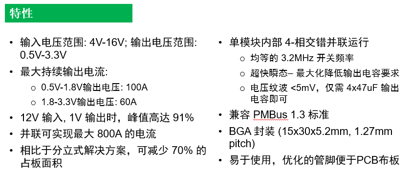 这颗“芯”是一款输出电流高达100A的全集成电源模块,可以灵活扩展,并且提供了PMBus接口,具有极好的负载和线性调整率,还可以并联工作以提供最大 800A 的持续输出电流,是FPGA/ASIC、加速卡、交换机应用的理想之选。