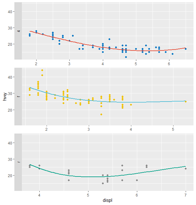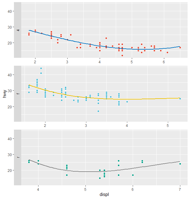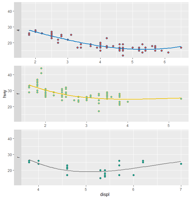 ggplot(mpg, aes(displ,hwy,fill=drv,color=drv)) +