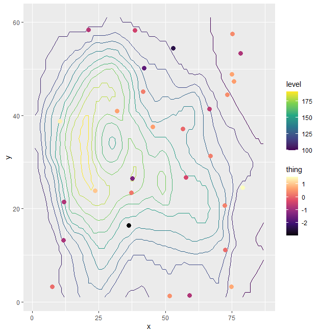 geom_contour(data = topography, aes(z = z, color = stat(level))) +