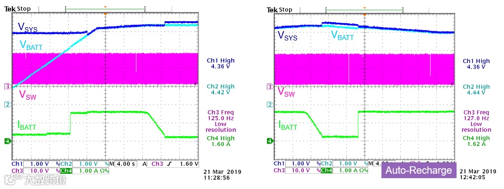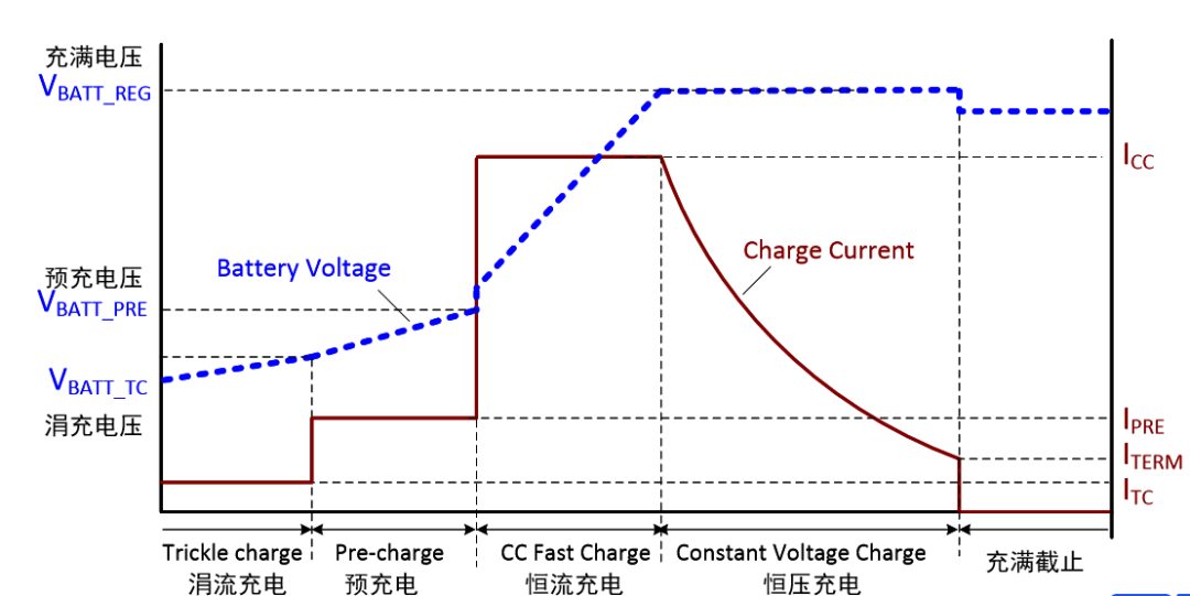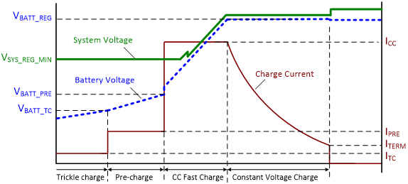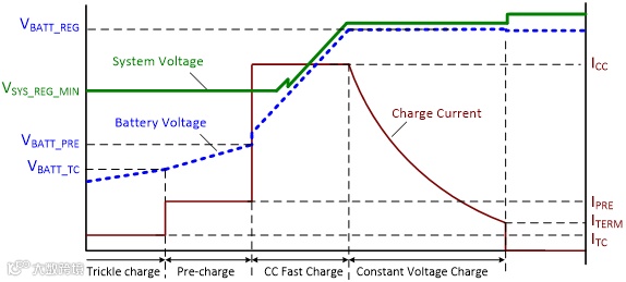 当电池电压比较低的时候,会把系统调节到最低的工作点,然后使用Battery FET给电池进行涓流/预充电,当电池电压高到一个阈值时,会把电池和系统接在一起,进行快速充电,电池充满后,系统会再高一点点,保证压差。