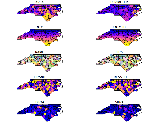 用 sf 包导入的北卡罗来纳州的地图可以产生如下结果: