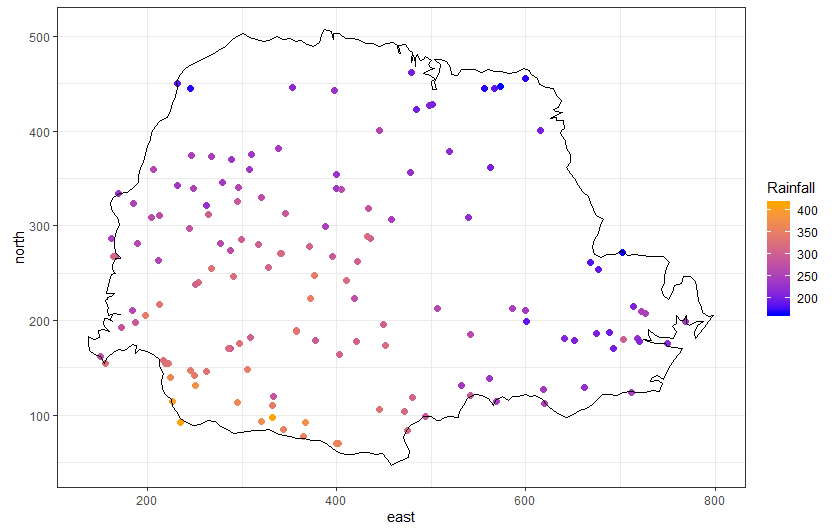例子:下图是巴西巴拉那州 143 个记录站的旱季平均降雨量: