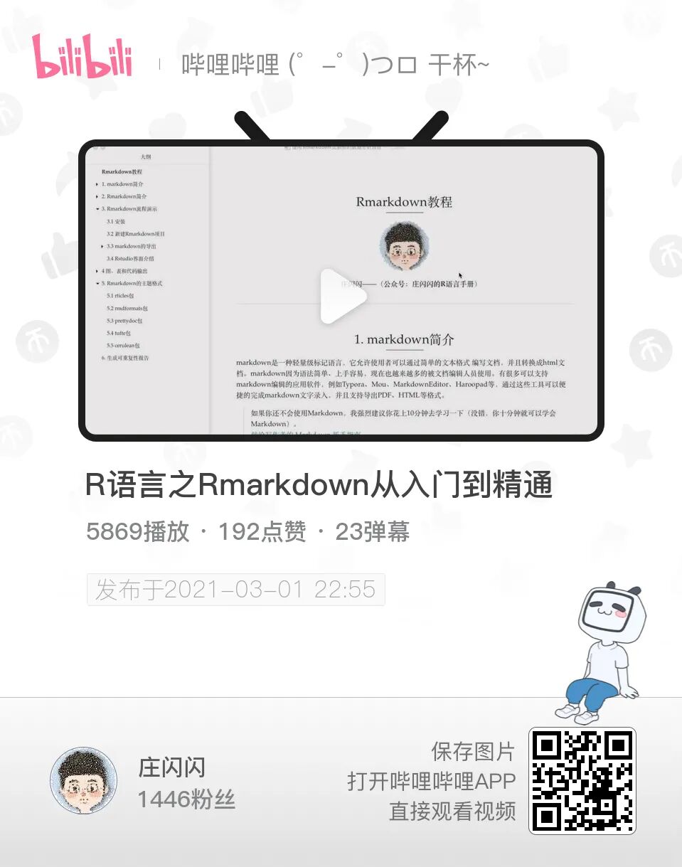 推荐: 可以保存以下照片,在 b 站扫该二维码,或者 b 站搜索【庄闪闪】观看 Rmarkdown 系列的视频教程。Rmarkdown 视频新增两节视频(写轮眼幻灯片制作)需要视频内的文档,可在公众号回复【rmarkdown】