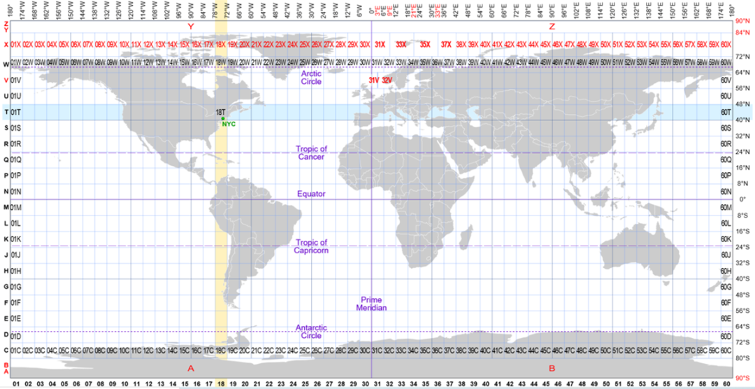 地球上的某一位置可由UTM区号、半球(南或北)以及区的东经和北纬的坐标(以米为单位)给出。关于这种投影进一步的细节,可查看维基百科[2]。