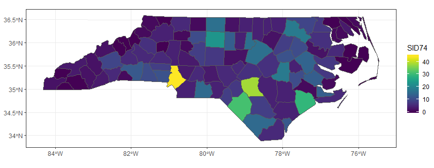 例子:1974 年美国北卡罗来纳州各县婴儿猝死数量(Sudden Infant Death),如下图所示: