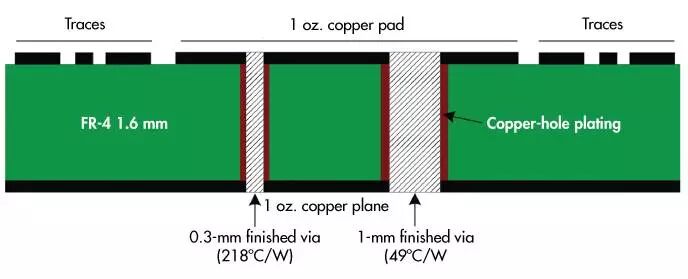 应使用大通孔(图2为通孔的横截面),且孔内应含有尽可能多的铜面积,以使热阻降至最低。