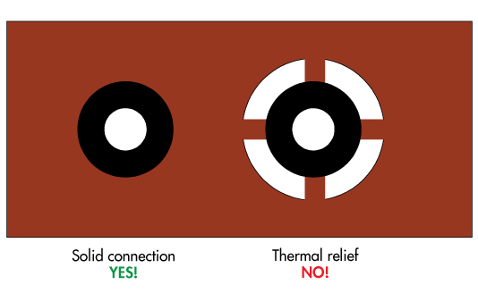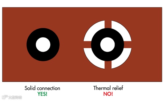 请注意,热通孔不得使用热风焊盘,它们必须直接连接至铜区域(图 3)。