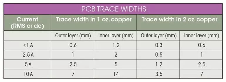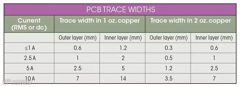设计师通常使用 IPC-2221 标准来确定适当的走线宽度。这一规范针对各种电流电平和允许的温升提供了显示铜横截面积的相应图表,可转换为给定铜层厚度条件下的走线宽度。例如 1 盎司铜层中承载 10 A 电流的走线需要稍宽于 7 mm,以实现 10℃ 的温升。针对 1-A 电流,走线宽度只需为 0.3 mm。