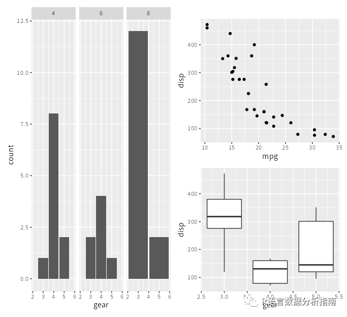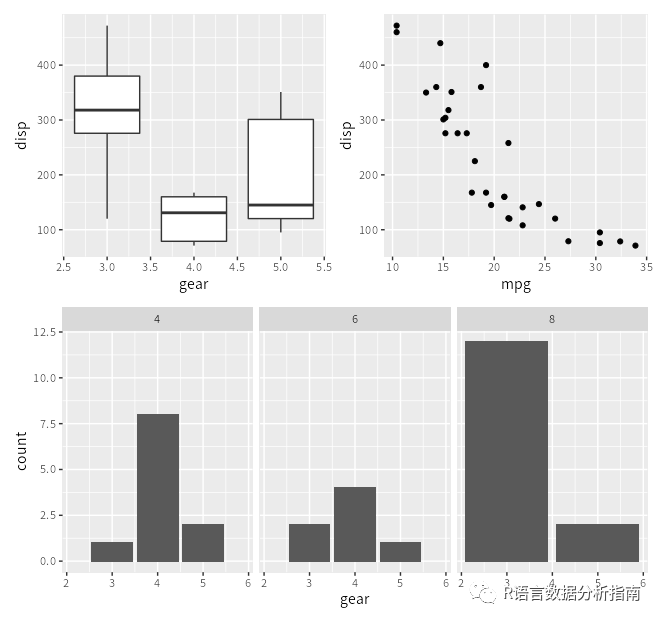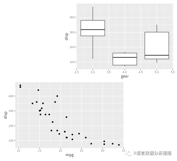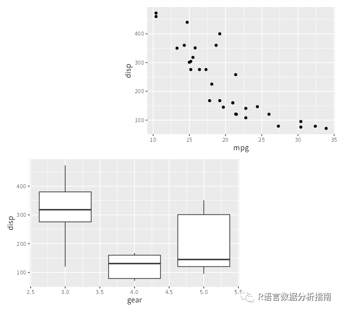 p2 <- ggplot(mtcars) + geom_boxplot(aes(gear, disp, group = gear))