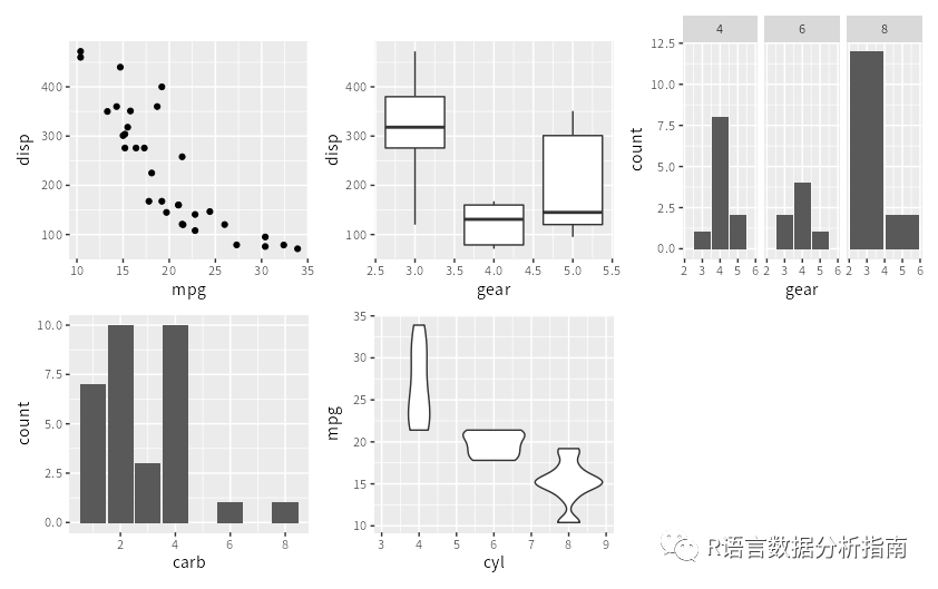 p3 <- ggplot(mtcars) + geom_bar(aes(gear)) + facet_wrap(~cyl)