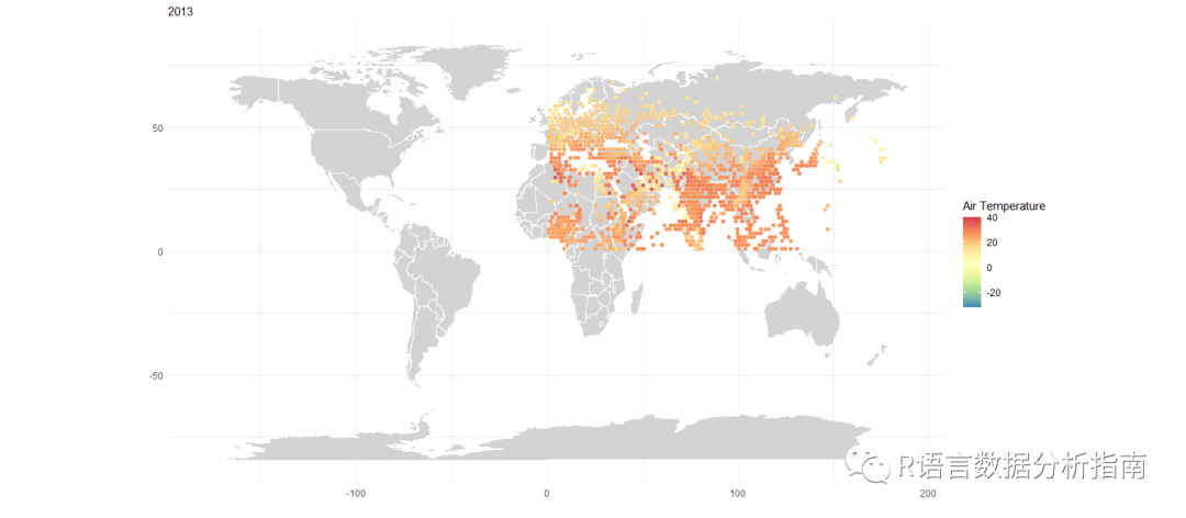 使用map_data(world),这将创建一个数据框,其中包含用于绘制每个国家/地区的信息。然后,通过ggplot()以创建一个画布,使用geom_polygon()将国家/地区添加到地图。使用已经处理好的df2013的数据将平均温度点添加到地图中。geom_jitter()设置点的抖动分隔原本会在地图上重叠的点