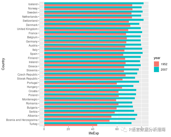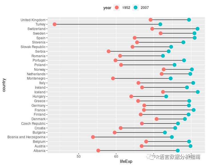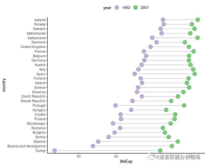 绘制哑铃图以比较所有欧洲国家从1952年到2007年的预期寿命变化。为了将这些点连接起来,需要指定连接的行或国家。因此创建一个新变量,用于指定与每个国家相对应的组