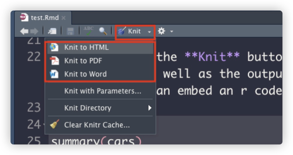 手动导出方法很简单,在完成mardown编辑后,手动点击上图红圈内knit按钮,选择导出格式类型即可,Rstudio支持导出PDF、html、word三种类型。
