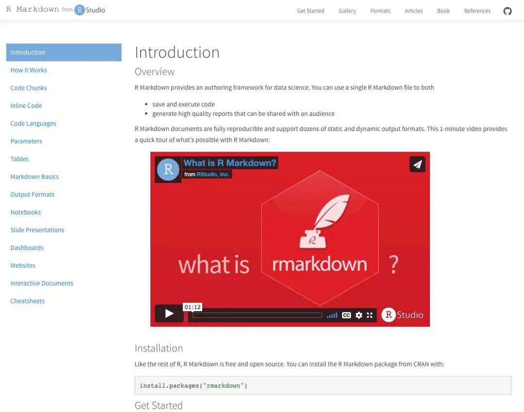 视频已经非常清楚的介绍了Rmarkdown如何使用,内部构造、不同的输出类型,以及其他拓展(发布,与github相连)等。我们先对此进行简单了解即可,之后几期我会详细介绍。当然,官网也有一套 Rmarkdown 的入门教程,欢迎大家前去学习,官网截图如下:
