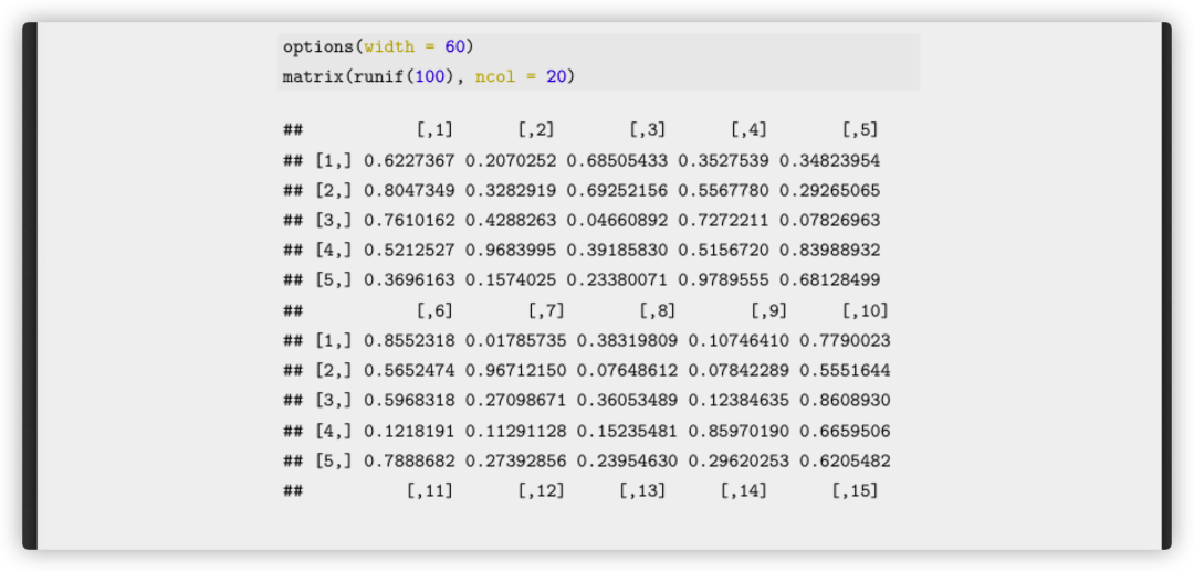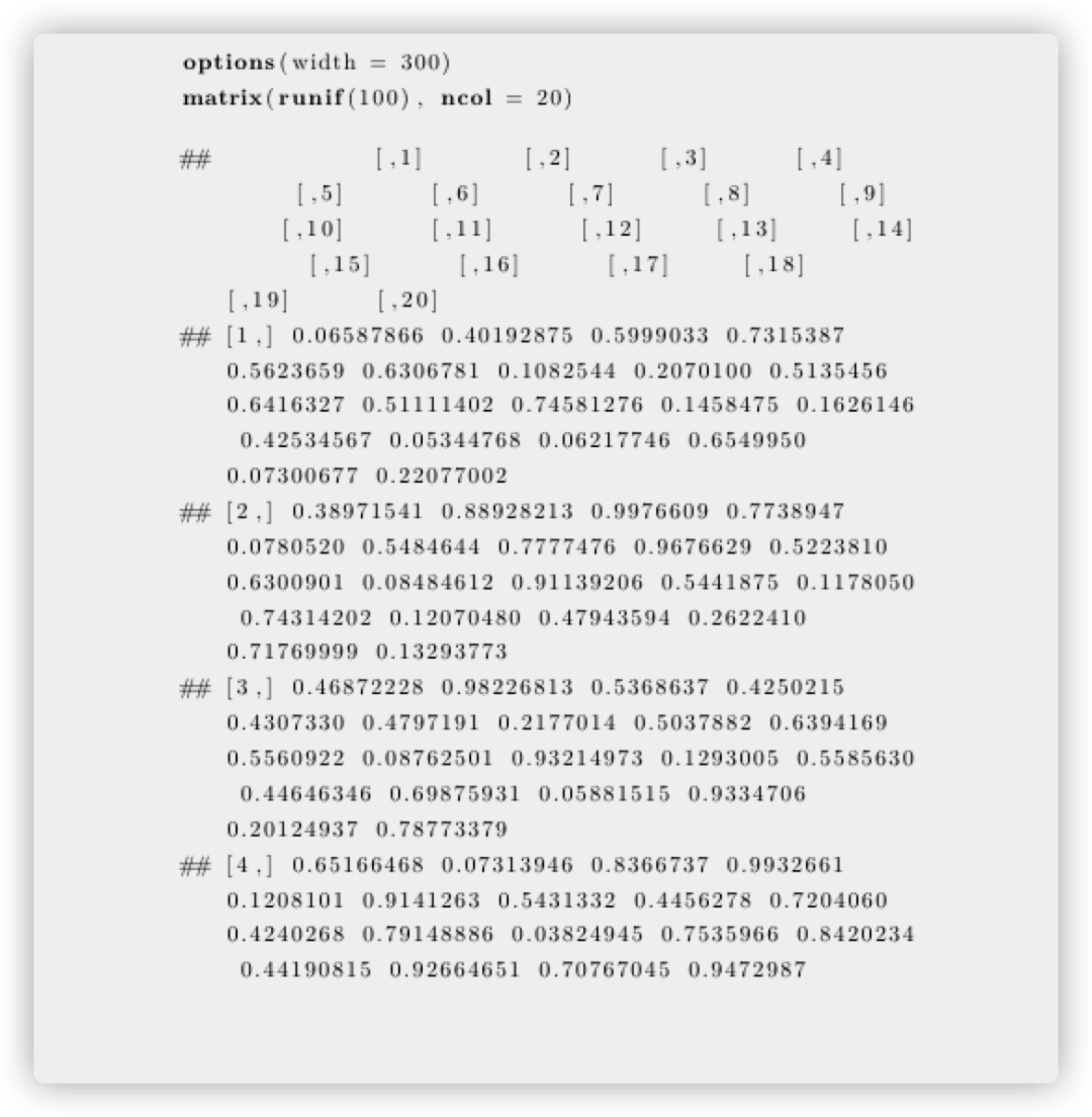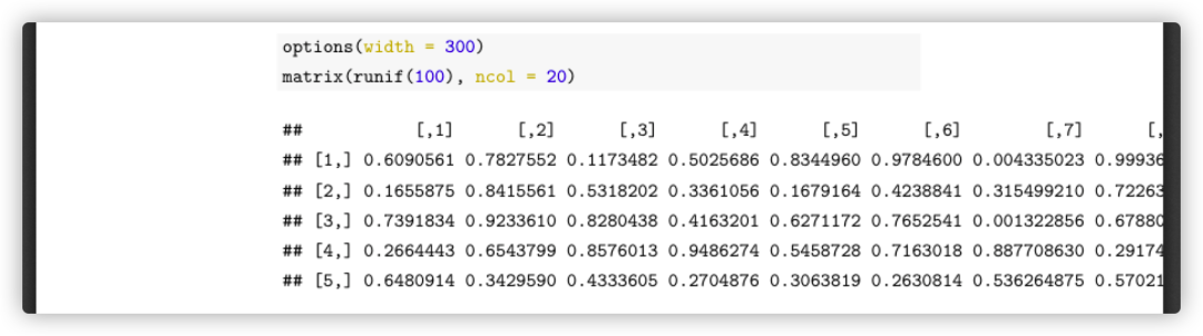 R全局选项宽度可用于控制R函数输出的文本宽度,如果默认值太大,则可以尝试使用较小的值。此选项通常表示每行字符的粗略数目。例如: