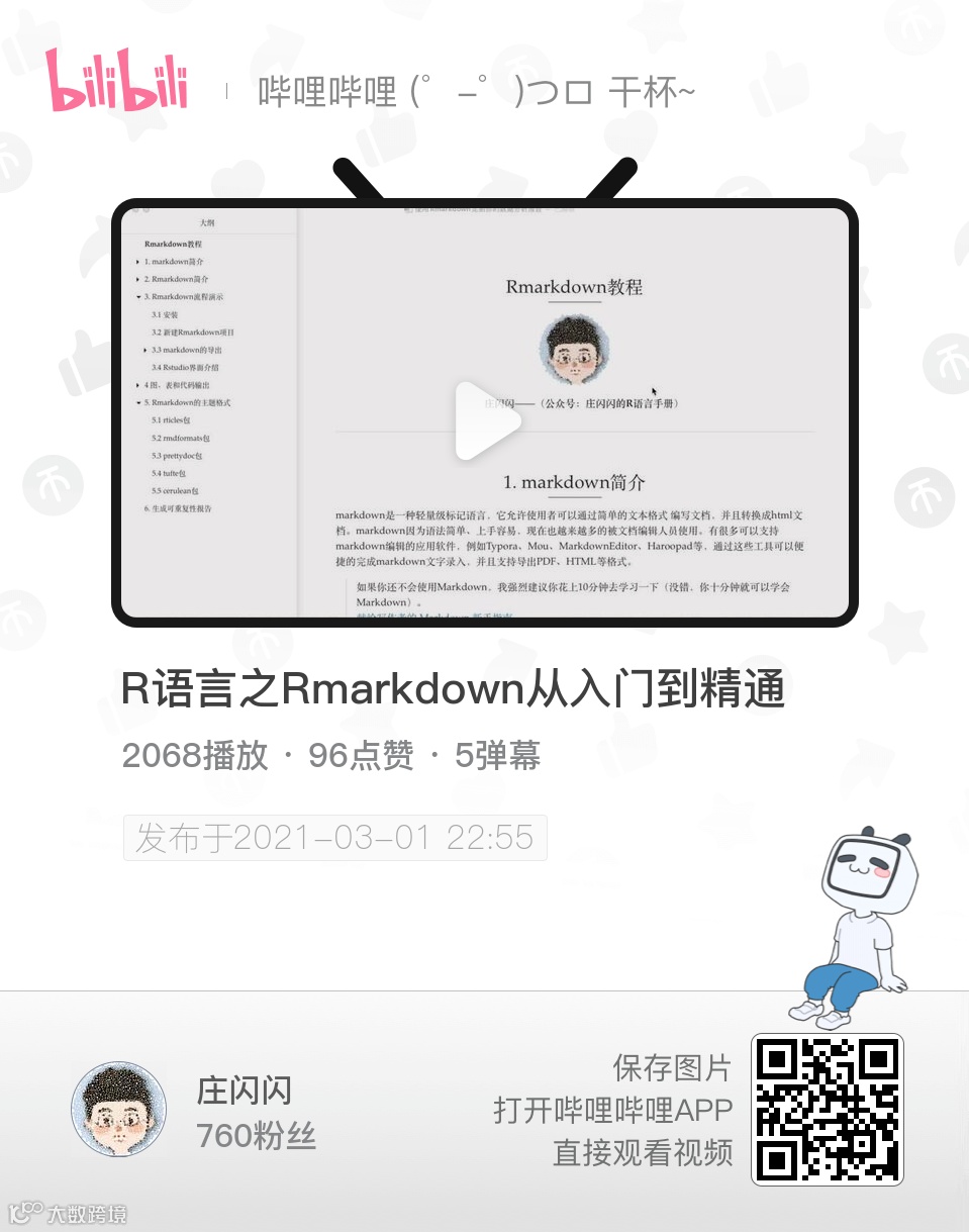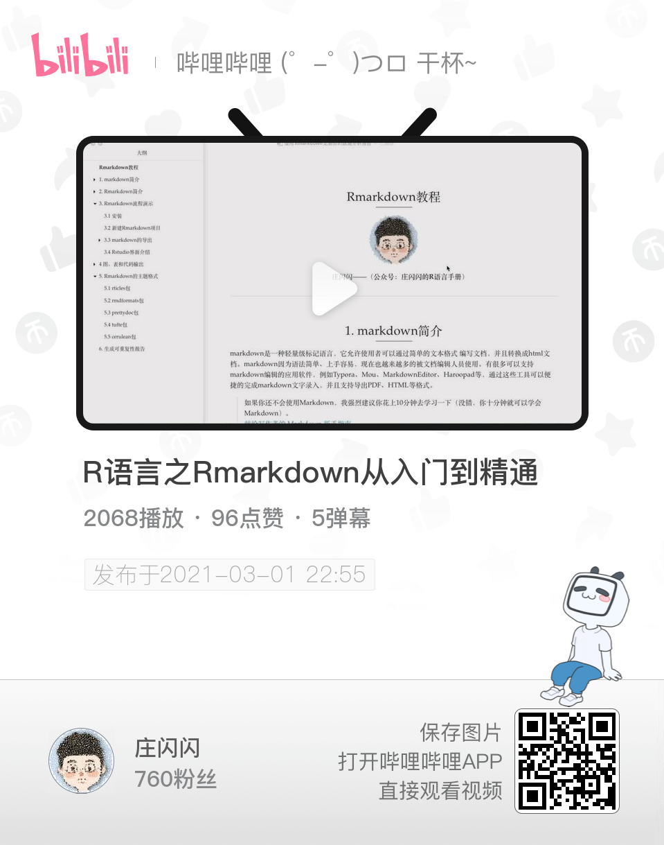 注:如果你觉得文字太生涩了,上面说的内容都可以在我的b站视频中学到。 可以保存以下照片,在b站扫该二维码,或者b站搜索【庄闪闪】观看Rmarkdown系列的视频教程。Rmarkdown视频新增两节视频(写轮眼幻灯片制作)需要视频内的文档,可在公众号回复【rmarkdown】