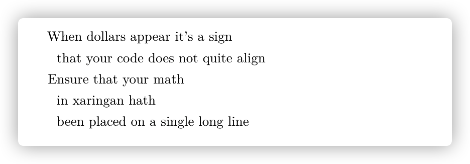 默认情况下,Markdown还将忽略用于缩进的空格。但是,在某些情况下,例如在经文和地址中,我们可能希望保留缩进。在这些情况下,我们可以通过以竖线(|)开头的线来使用线块。换行符和所有前导空格将保留在输出中。例如: