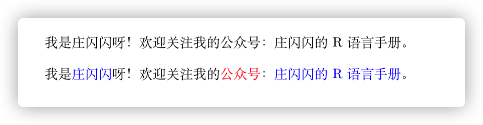 我是\textcolor{blue}{庄闪闪}呀!欢迎关注我的\textcolor{red}{公众号}:\textcolor{blue}{庄闪闪的R语言手册}。