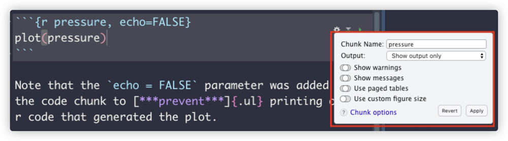 默认情况下代码和结果会在输出文件中呈现。如果通过参数来控制代码块运行结果的输出情况可以在{r }中设置。一般包括代码及运行结果的输出、图片表格格式定义等。关于代码段选项,详见https://yihui.name/knitr/options。
