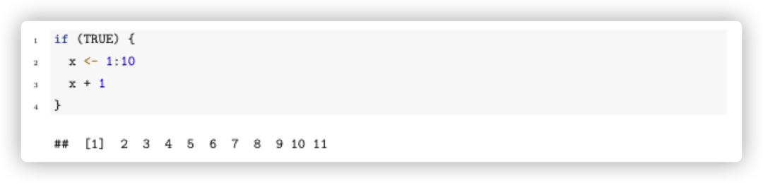 collapse选项一个代码块的代码、输出通常被分解为多个原样文本块中, 如果一个代码块希望所有的代码、输出都写到同一个原样文本块中, 加选项 collapse=TRUE。例如: