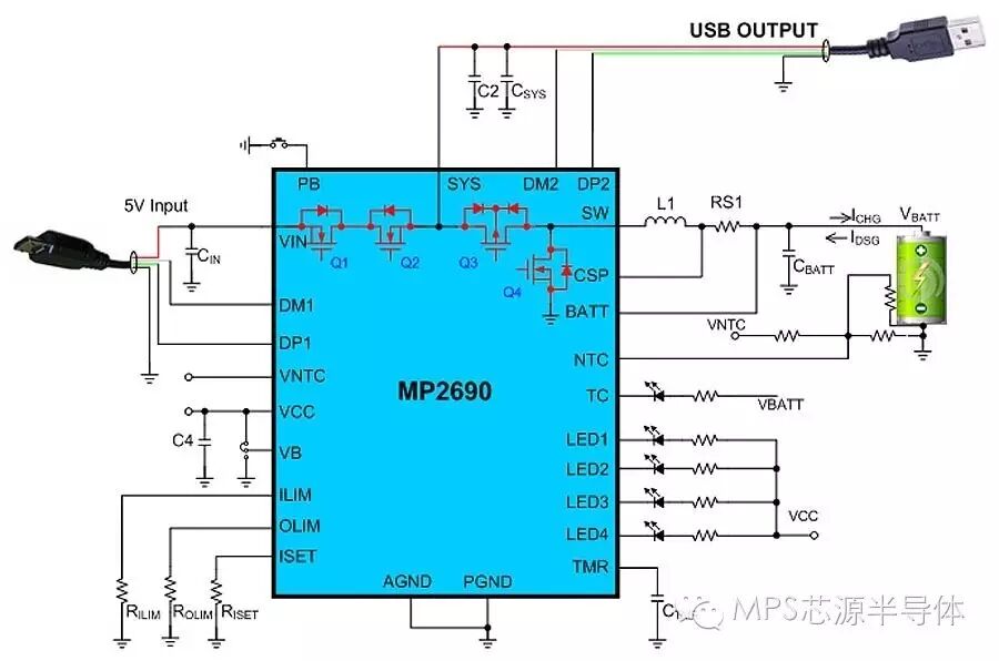 MPS推出的MP2690旨在为充电宝提供一种小体积高可靠的备电解决方案。MP2690集降压充电,升压放电,反向电流阻断以及所有充电保护监控功能于一体,仅需单颗电感和少量外围器件就可实现充电宝的全部功能,简单可靠。