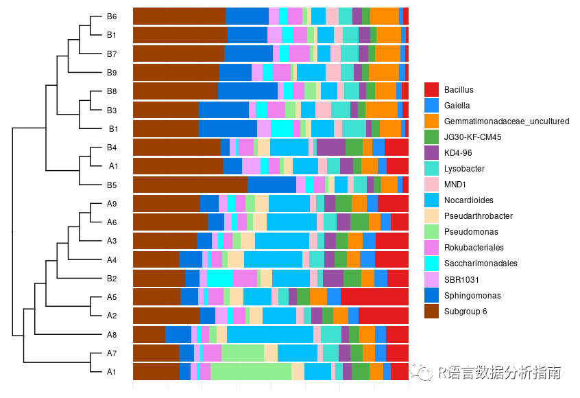 通过ggplot2绘制一个美观的堆砌条形图,并添加聚类树,关注公众号R语言数据分析指南后台回复treebar获得实例数据及代码,废话不多说直接看代码