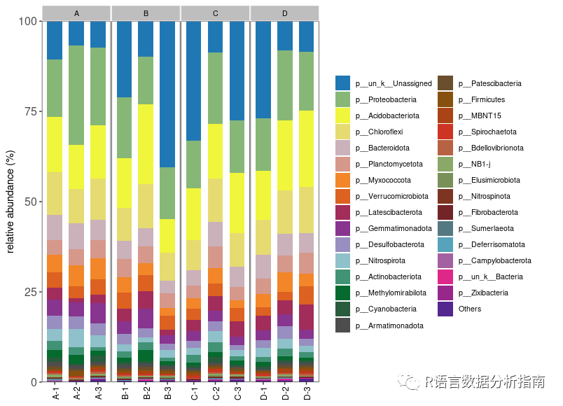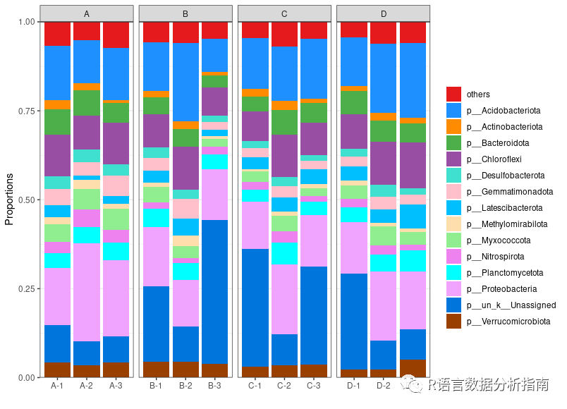 本节我们来绘制微生物的物种组成图;先通过phyloseq包整合数据,之后利用MicrobiotaProcess包绘制门水平物种组成图,最后通过ggplot2自定义绘制物种组成图,喜欢的小伙伴可以关注我的公众号R语言数据分析指南,后台回复关键词物种组成图获取全部数据及代码
