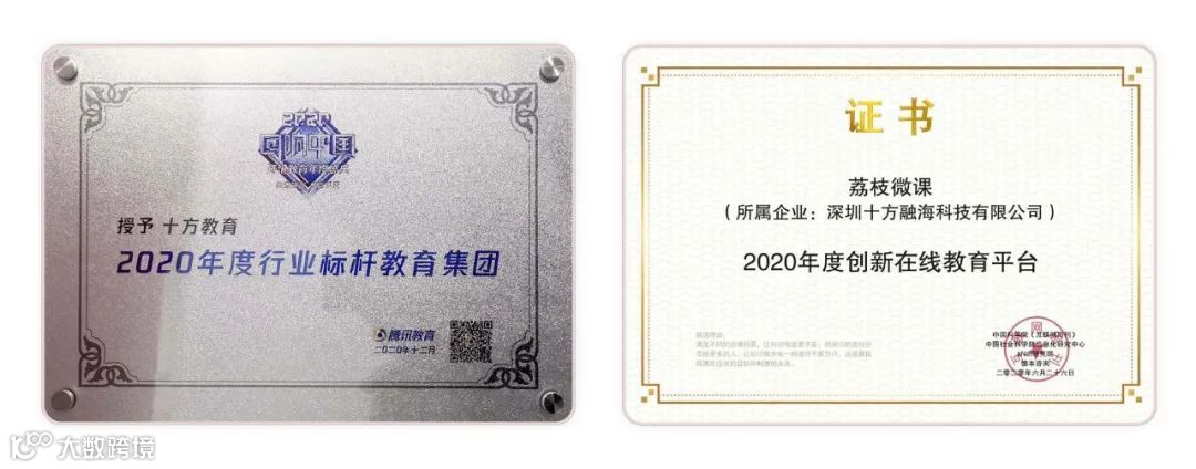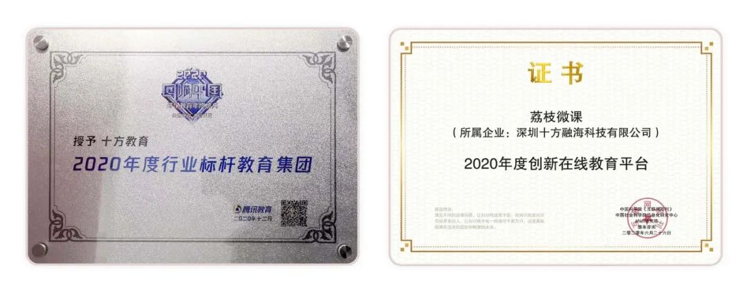 十方教育获得腾讯颁发的“2020年度行业标杆教育集团”这一称号。