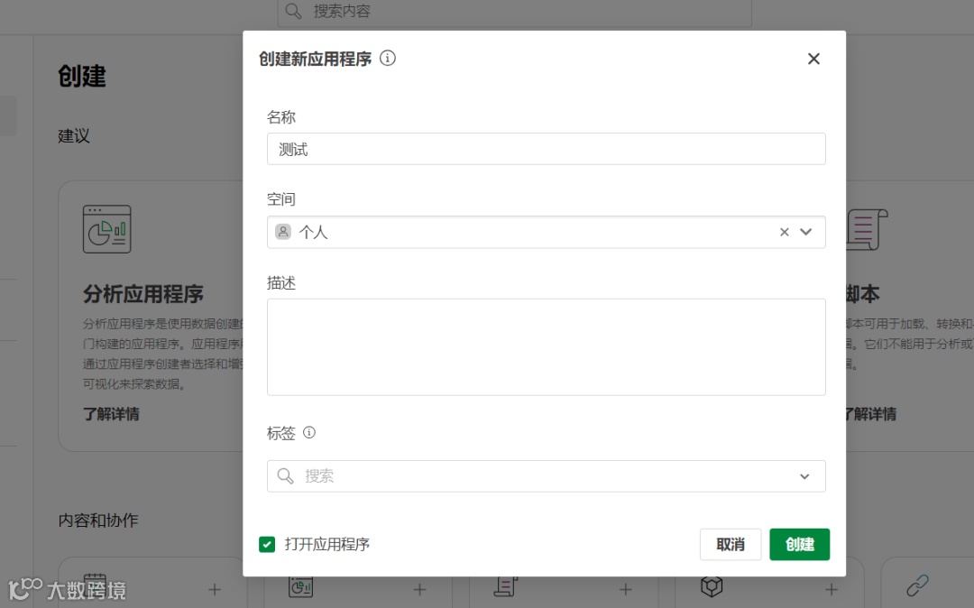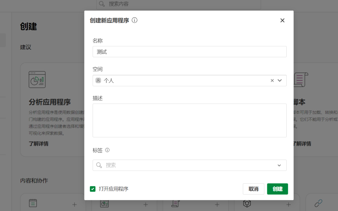 点击“创建”菜单并选择“创建分析应用程序”,这个类似于其他BI工具创建一个报告或视图的操作
