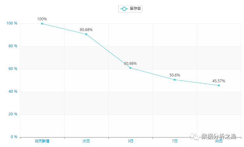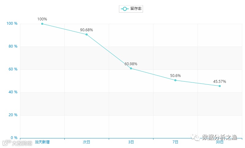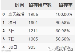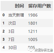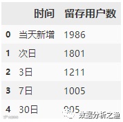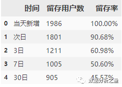 import pandas as pd# 创建一个 dataframed = {"时间": ["当天新增","次日","3日","7日","30日"],"留存用户数":[1986,1801,1211,1005,905]}df = pd.DataFrame(data = d)df