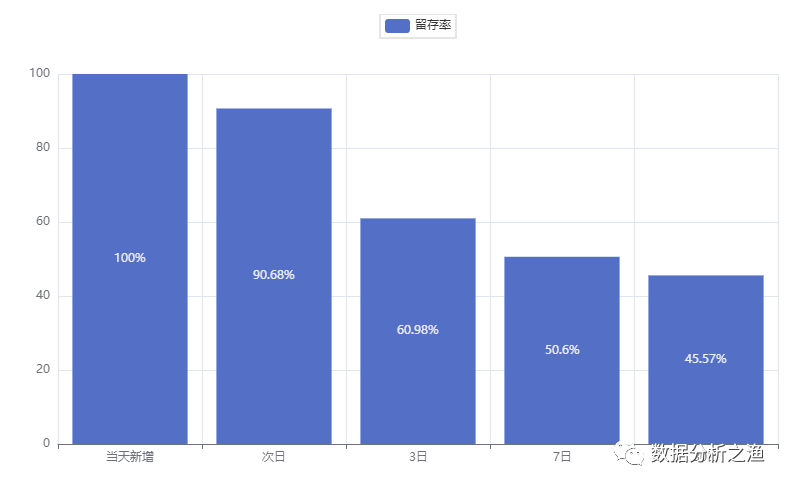 c = (Bar().add_xaxis(data_x).add_yaxis("留存率",data_y_0,label_opts=opts.LabelOpts(formatter="{c}%")).set_global_opts(tooltip_opts=opts.TooltipOpts(formatter="{c}%")))c.render_notebook()