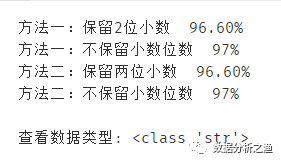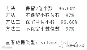 #假设结果为 96.6 ,赋值给变量xx = 96.6print('方法一:保留2位小数 %.2f%%'%x)# 当不保留小数时,输出结果默认四舍五入print('方法一:不保留小数位数 %.0f%%'%x)print('方法二:保留两位小数 {:.2f}%'.format(x))# 当不保留小数时,输出结果默认四舍五入print('方法二:不保留小数位数 {:.0f}%'.format(x))# 注意输出结果均为字符串(str)格式# 查看输出结果的类型type('{:.0f}%'.format(x))