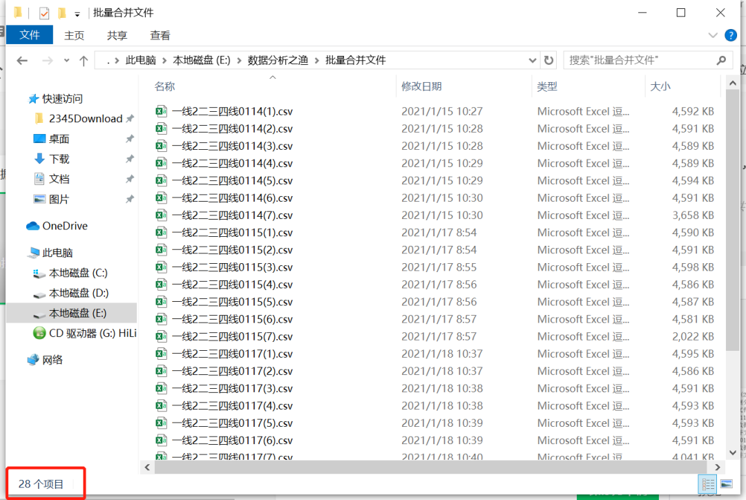 该方法的前提是需要保证列数相同,并且是同类型的数据。将所有需要合并的表格放在同一个文件夹中。如下面的例子共28个不同时间的表需要合并