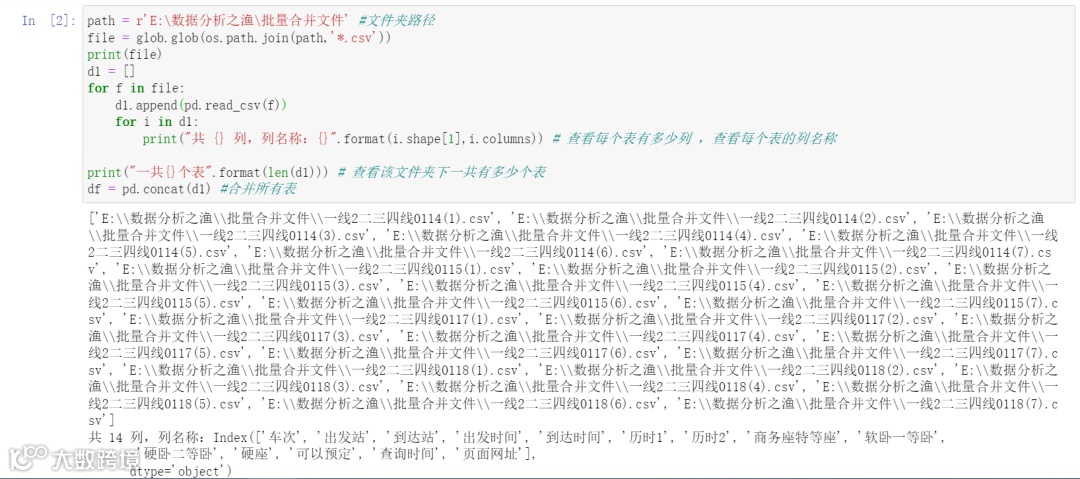 path = r'E:\数据分析之渔\批量合并文件' #文件夹路径file = glob.glob(os.path.join(path,'*.csv'))print(file)d1 = []for f in file:d1.append(pd.read_csv(f))for i in d1:print("共 {} 列,列名称:{}".format(i.shape[1],i.columns)) # 查看每个表有多少列 ,查看每个表的列名称print("一共{}个表".format(len(d1))) # 查看该文件夹下一共有多少个表df = pd.concat(d1) #合并所有表