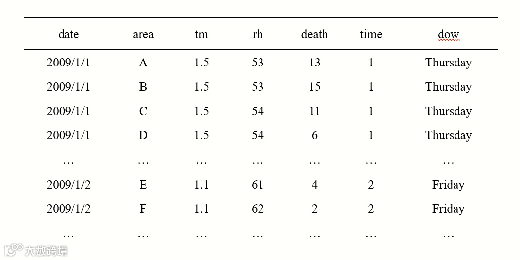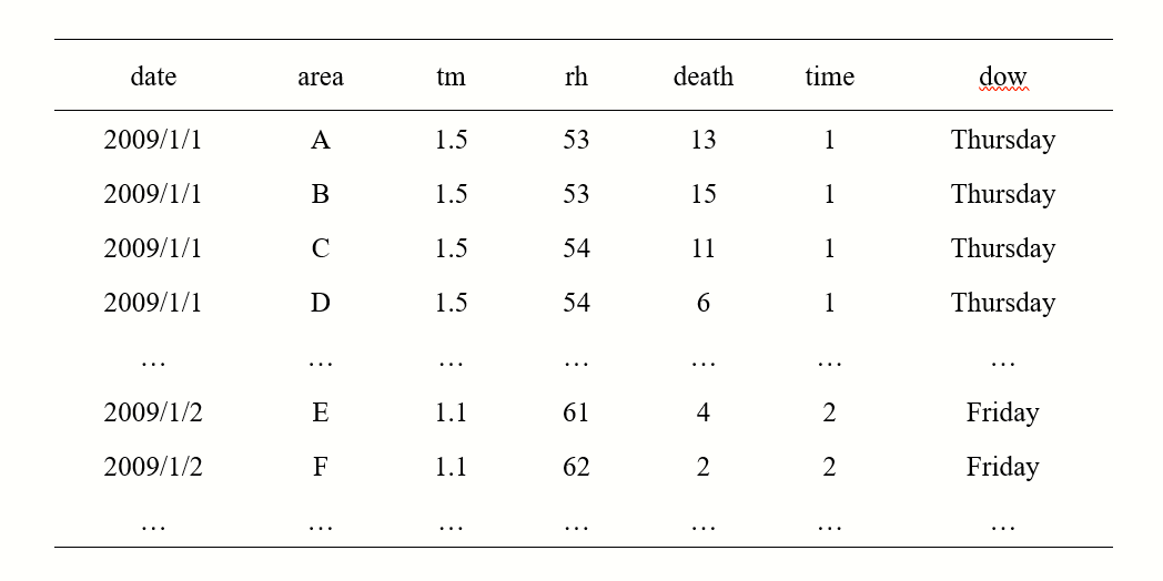 下面,我们随机抽取了6个气象监测点的气象数据,时间为2009年1月1日-2015年12月31日,并模拟了气象监测站点所在的每日死亡数,构建了气象健康数据库,用于探索日均气温与死亡数的暴露-反应关系。