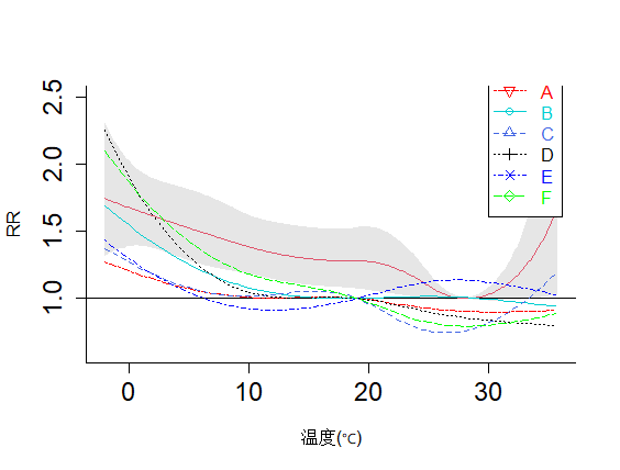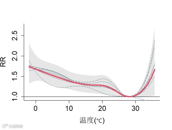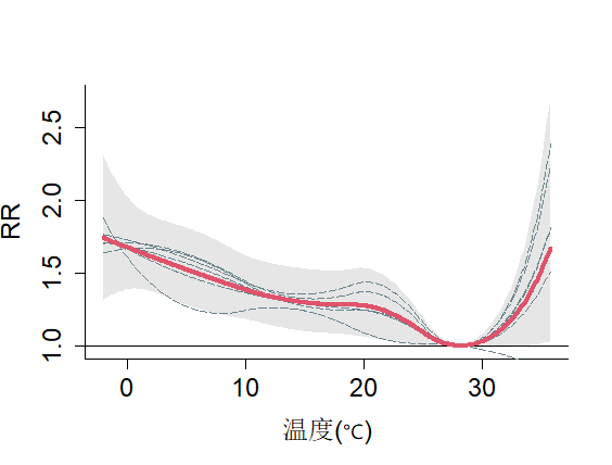 经过循环之后,上述coef和vcov文件中分别保存了6个地区模型拟合的温度交叉基系数和协方差矩阵,基于这两个文件,我们可以使用meta进行合并,获得合并的系数。在此基础上,我们基于所有地区的温度范围,建立一段温度序列,经过bs样条函数转化后,可用于预测获取每个温度的效应值,并进一步绘制汇总的暴露-反应关系曲线。代码如下:
