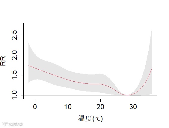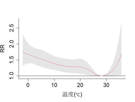 plot(all.cp,"overall",col=2,cex.axis=1.50,xlab="温度(℃)",ylab="RR",