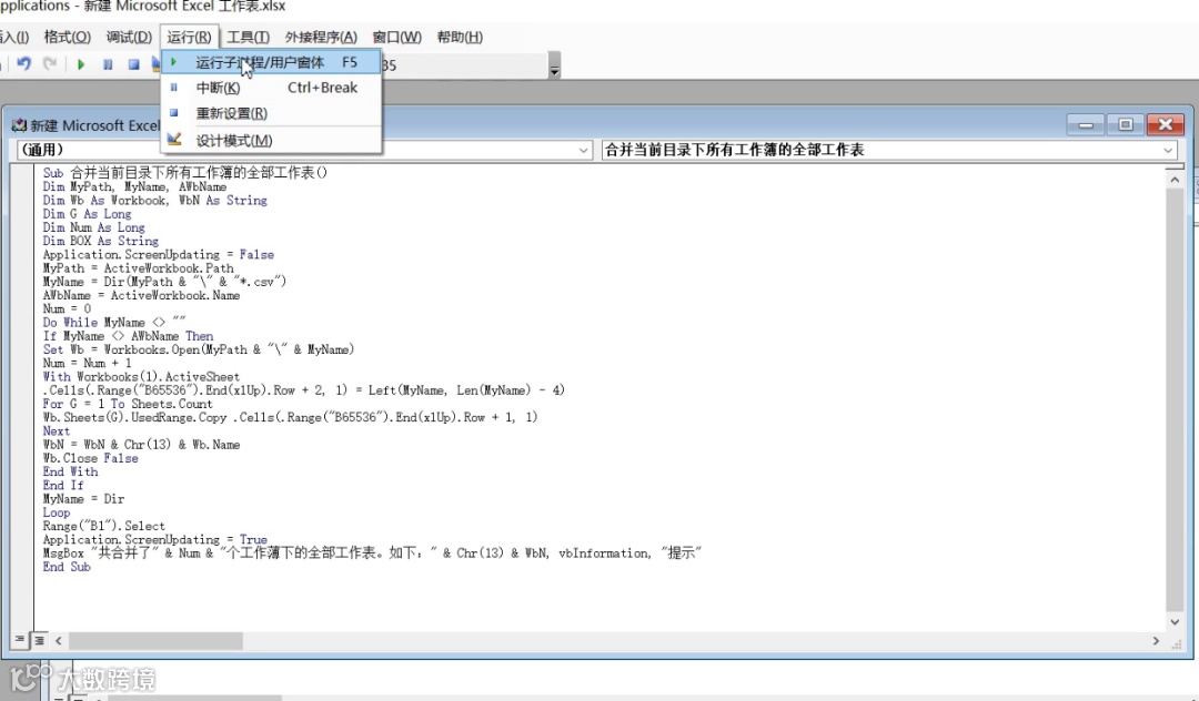3、粘贴代码,并选择运行中的“运行子过程/用户窗体”