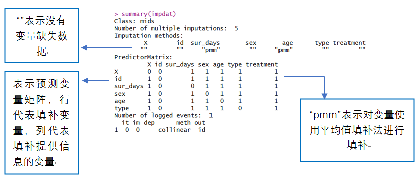 impdat <- mice(data1,m=5,method=c("pmm"))#采用PMM法进行多重填补,m=5