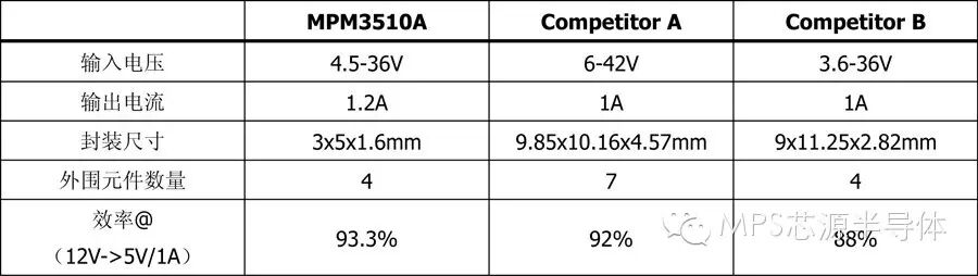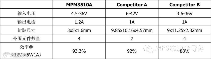 MPM3510A无论是从尺寸,还是性能上,都是同规格电源模块中的佼佼者。下表是MPM3510A跟市场上另外两款主流电源模块的数据比较,很显然,MPM3510A在尺寸上遥遥领先,让我们见识了什么才是真正的微。