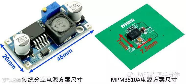 基于MPM3510A的电源方案的尺寸远小于传统的分立电源方案:传统的设计方案中,整个电源需要多达45mmx20mm的印刷板的位置;而使用MPM3510A的设计方案,尺寸锐减到7.5mmx7mm,面积只有原来的6%,6%,6%(重要的事情说三遍!)。你完全无法想象这将为捉襟见肘的电源设计师们节约多少空间!