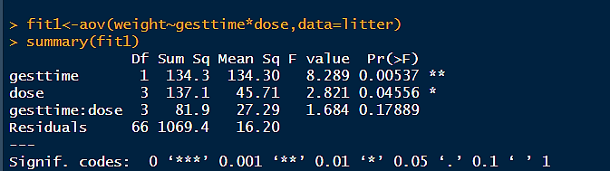 fit1<-aov(weight~gesttime*dose,data=litter) #回归斜率的同质性检验
