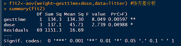 fit2<-aov(weight~gesttime+dose,data=litter) #协方差分析